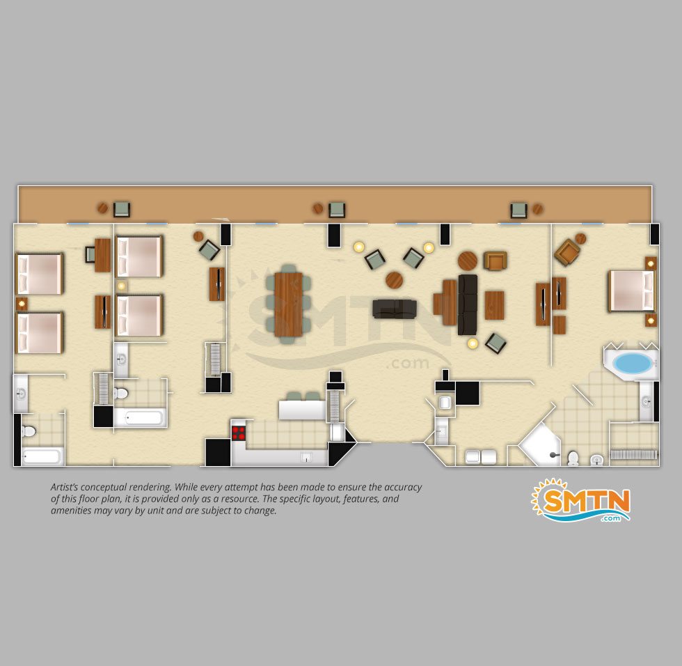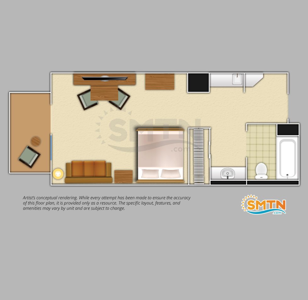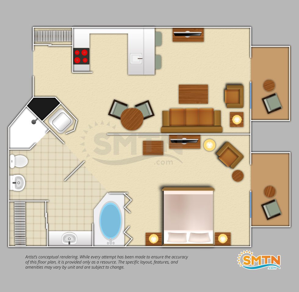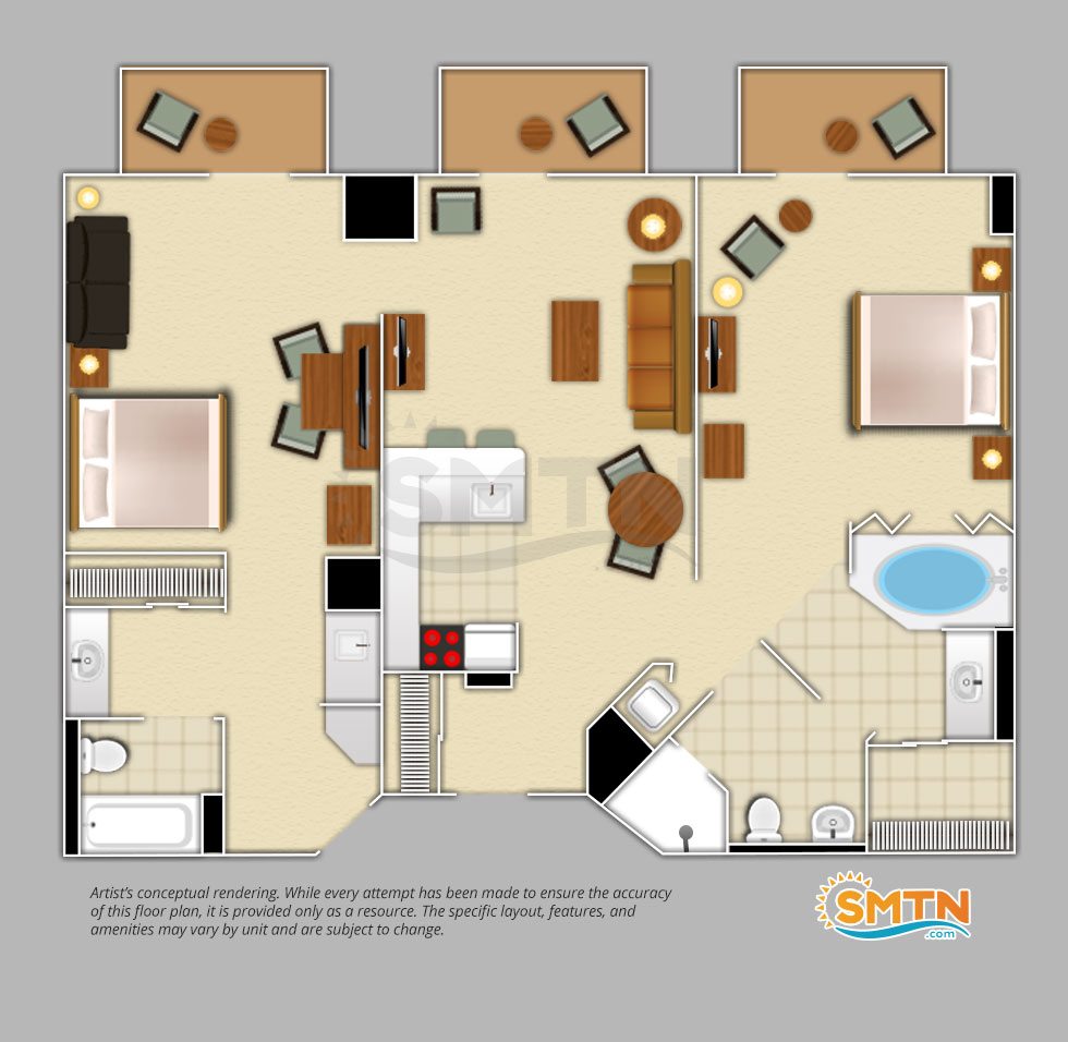 Villa accommodations are available in studio, one-, two-, and three-bedroom units. Each offers a standard, boardwalk, or pool/garden view that you can enjoy from the peace and quiet of your private balcony. Convenient amenities such as full kitchens and washers and dryers are available in most units, and your family will thoroughly enjoy the privacy and space the separate bedrooms offer. Decor is simple, yet tasteful, and offers a soft color pallette to let you fully relax after a long day.