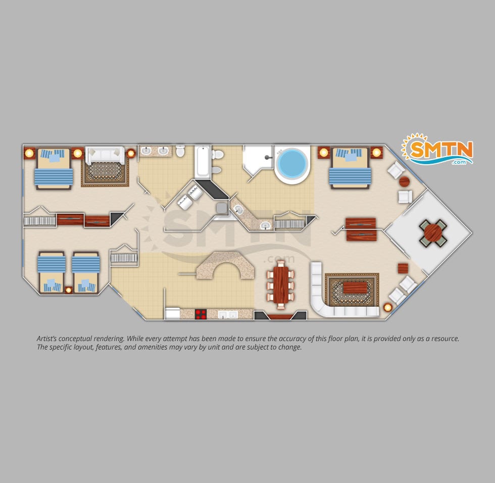 Accommodations at the resort consist of incredibly spacious and welcoming three bedroom villas that come filled with homelike amenities to ensure you're comfortable. You'll find over 1,500 square feet of space that sleeps up to ten guests comfortably. Enjoy your full kitchen, spacious living area with up-to-date entertainment systems, a private balcony, whirlpool spa-style tubs, and so much more. You'll have everything you need to feel right at home during your Orlando getaway.