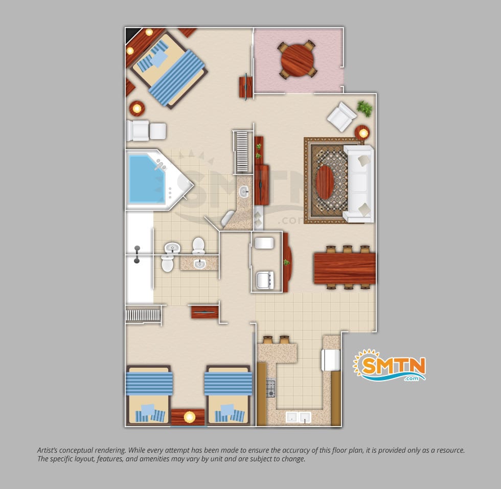 At Sheraton Vistana Resort Fountains Villas 2, you’ll be staying in a cozy two-bedroom unit with bright, soft colors to optimize your relaxation. Each unit comes with incredible amenities such as a full kitchen, spacious living room with a pull-out sofa bed, a whirlpool tub in the master bath, and a rustic dining room area great for enjoying home cooked meals. Whether you’re taking the family out for a well-deserved vacation, having fun with a handful of friends, or embarking on brand new adventures with the special someone, Sheraton Vistana Resort Fountains II Villas will ensure that your vacations will create some of your life’s greatest memories.