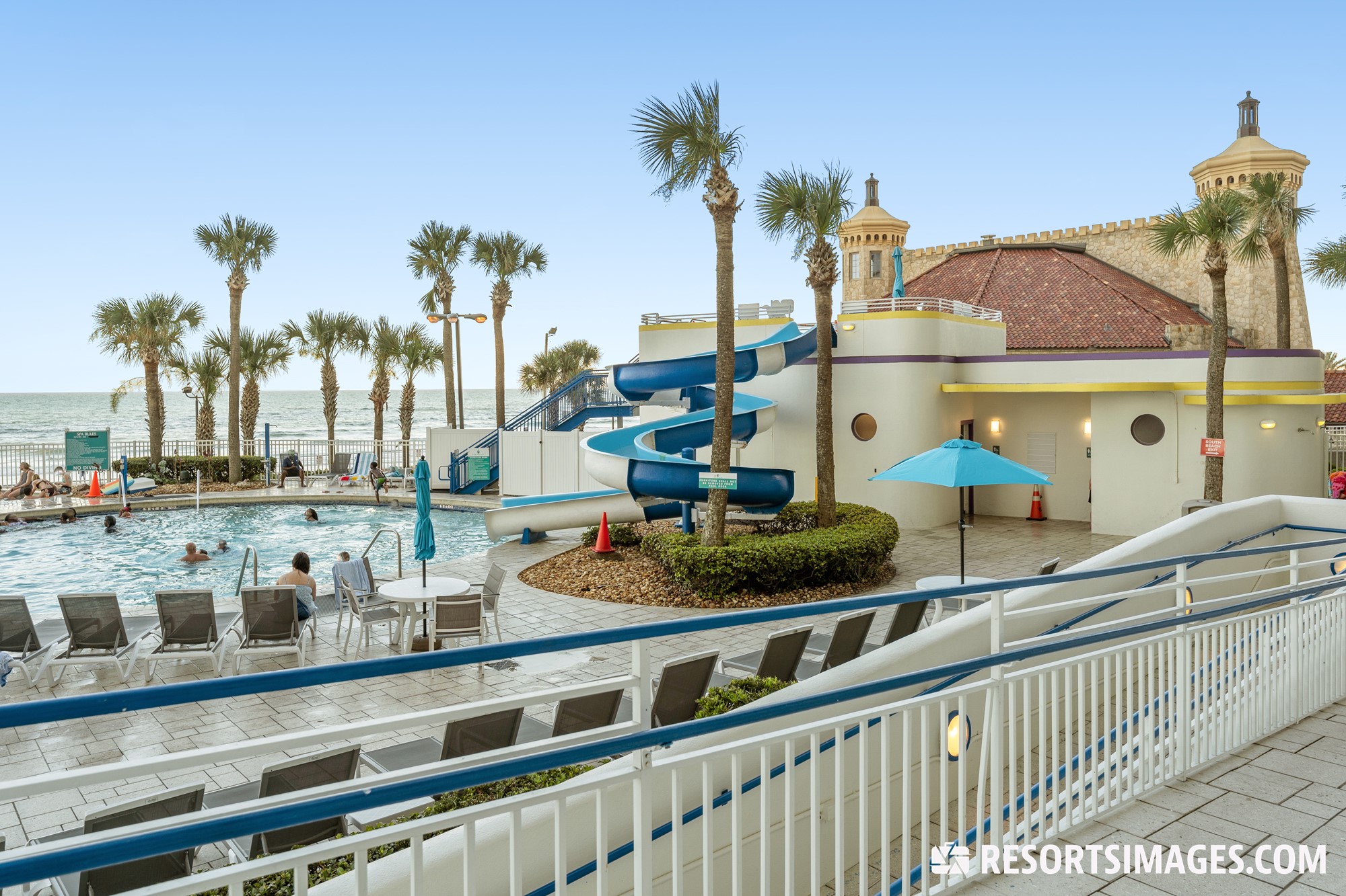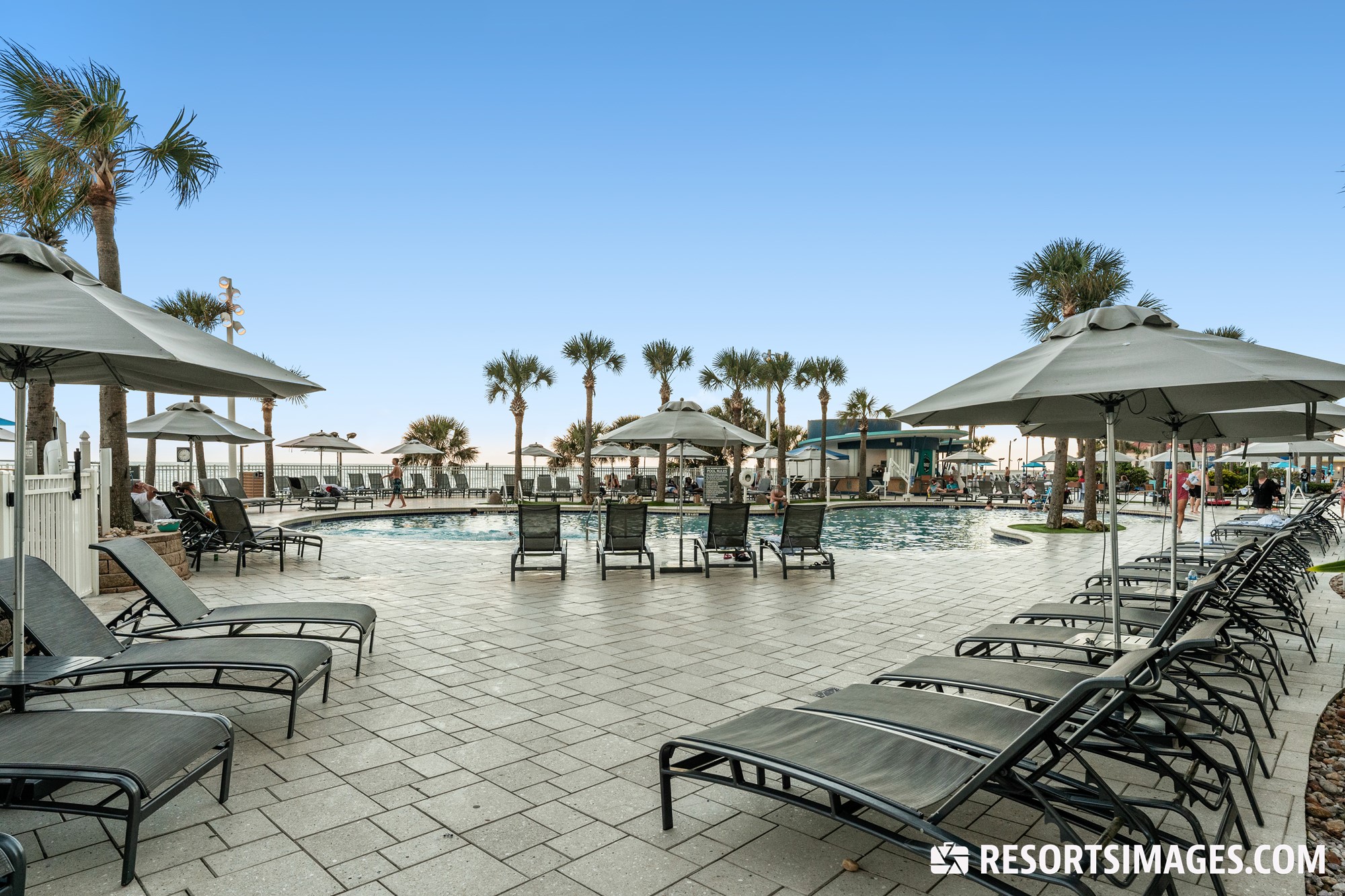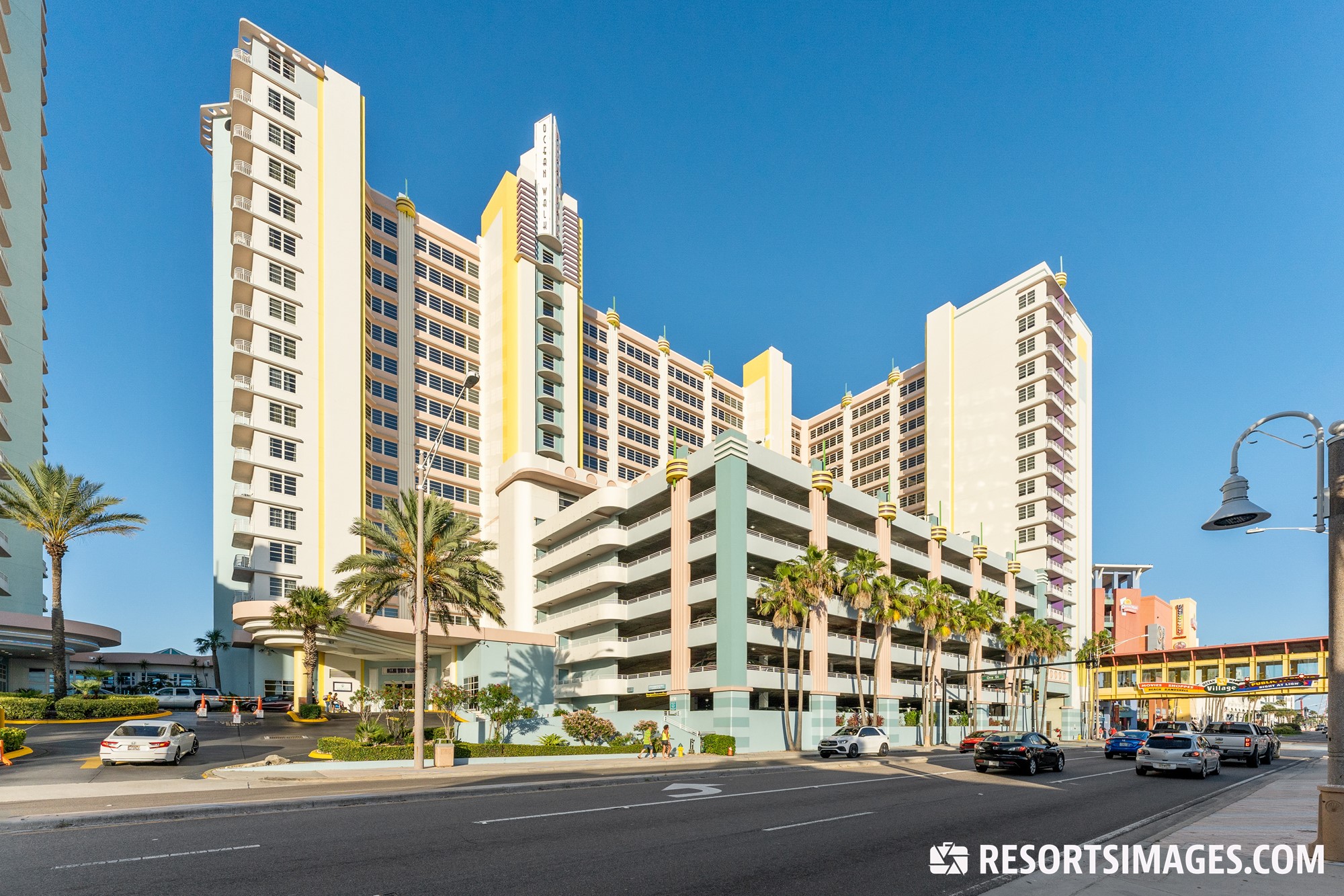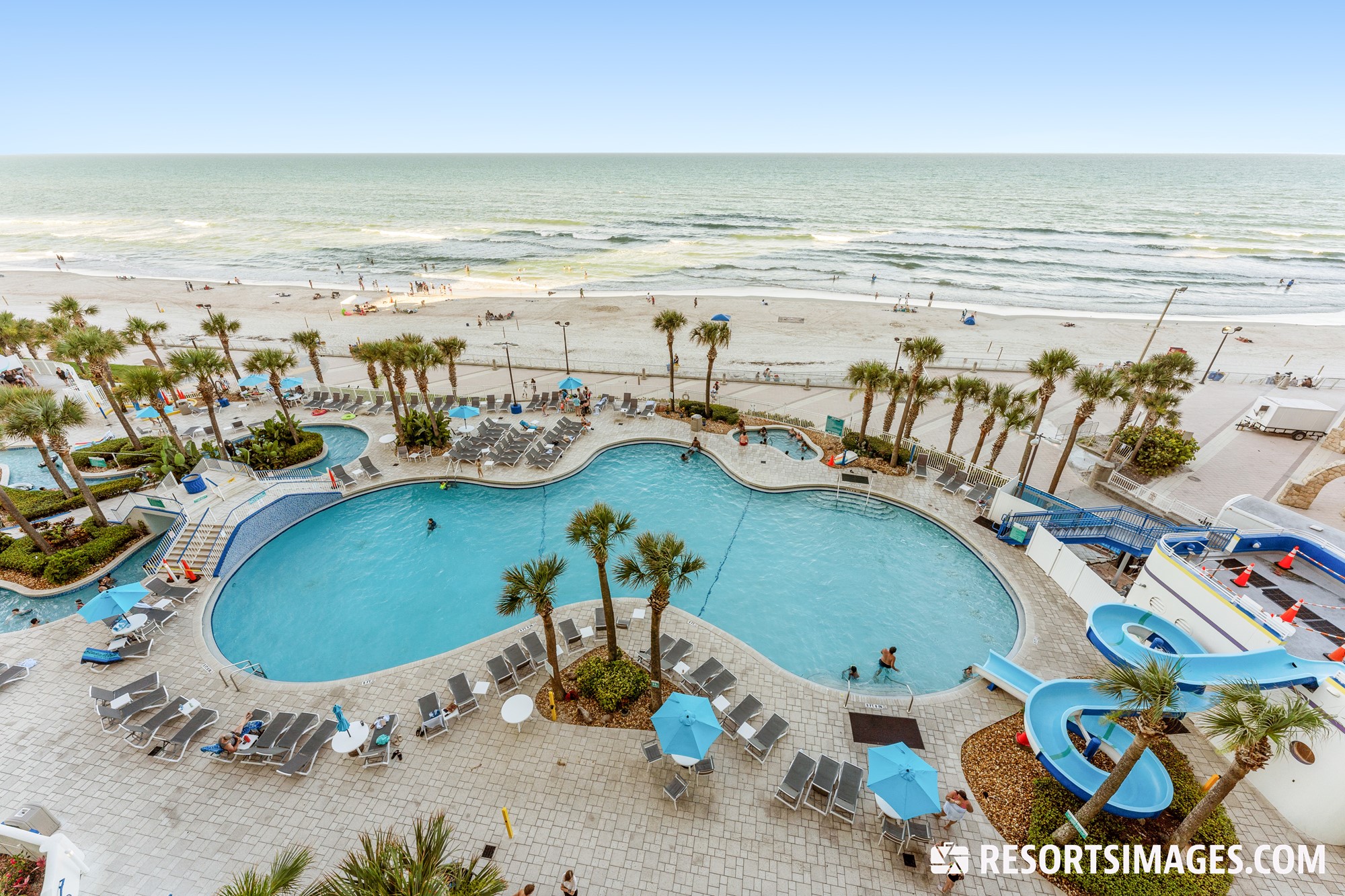 The *Wyndham Ocean Walk* resort is located directly on the beach with a full service food court, lobby bar, exercise room, indoor pool, arcade, gift shop, golf simulator, and activities center. You will also find an outdoor pool, Jacuzzi, lazy river, and water slide. The resort offers a full service banquet facility and in-house chef, and room service. Adjacent to the property is Daytona's newest Ocean Walk Shoppes and Theatres, Bandshell Amphitheater, and Boardwalk.