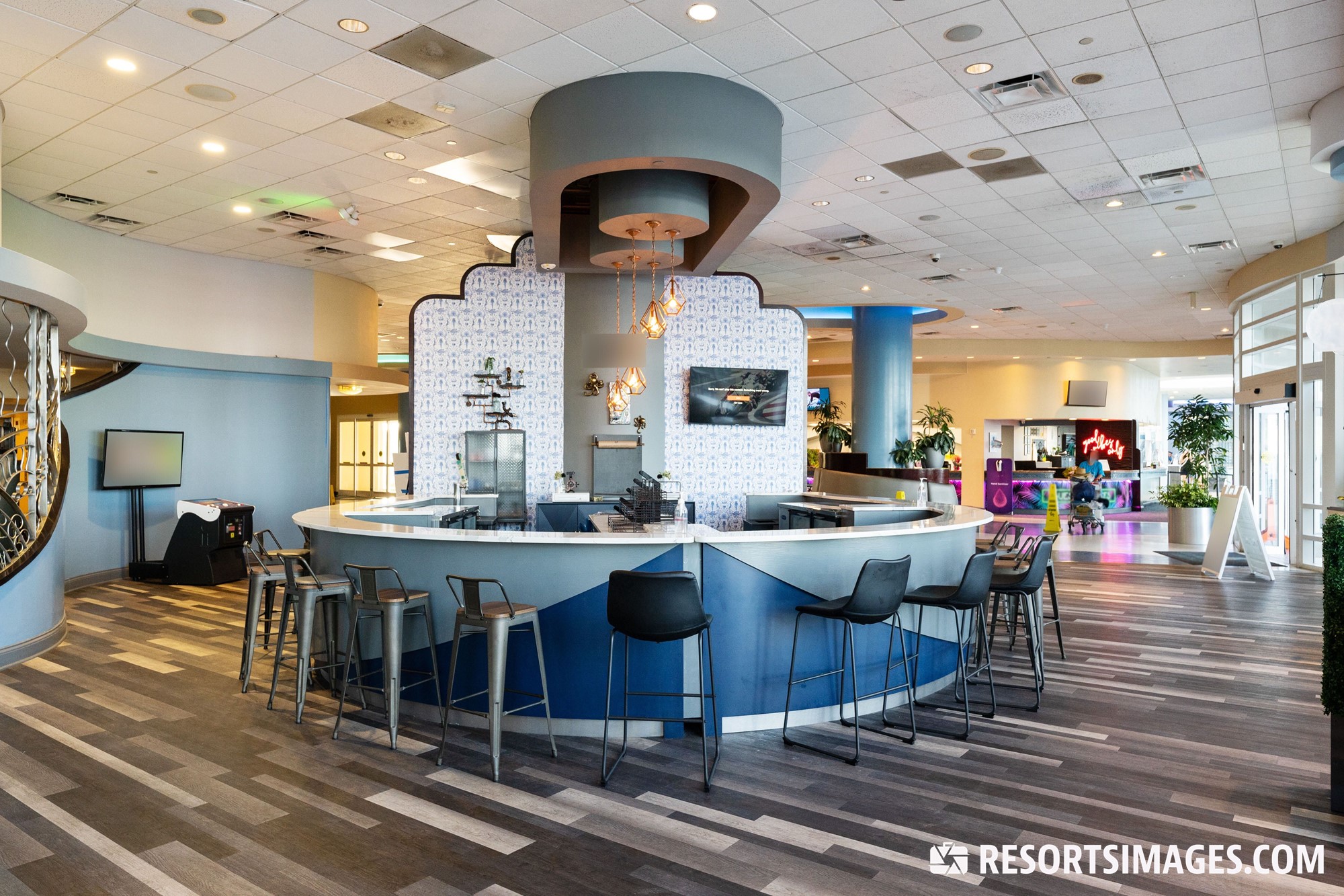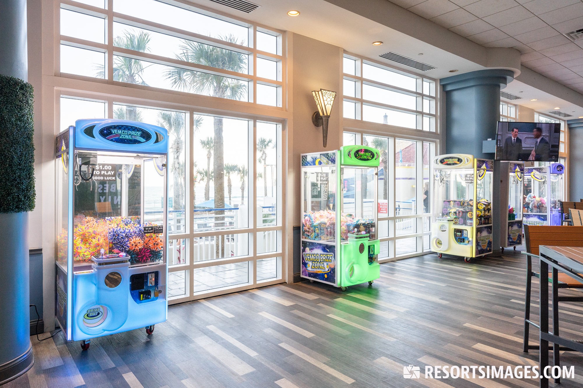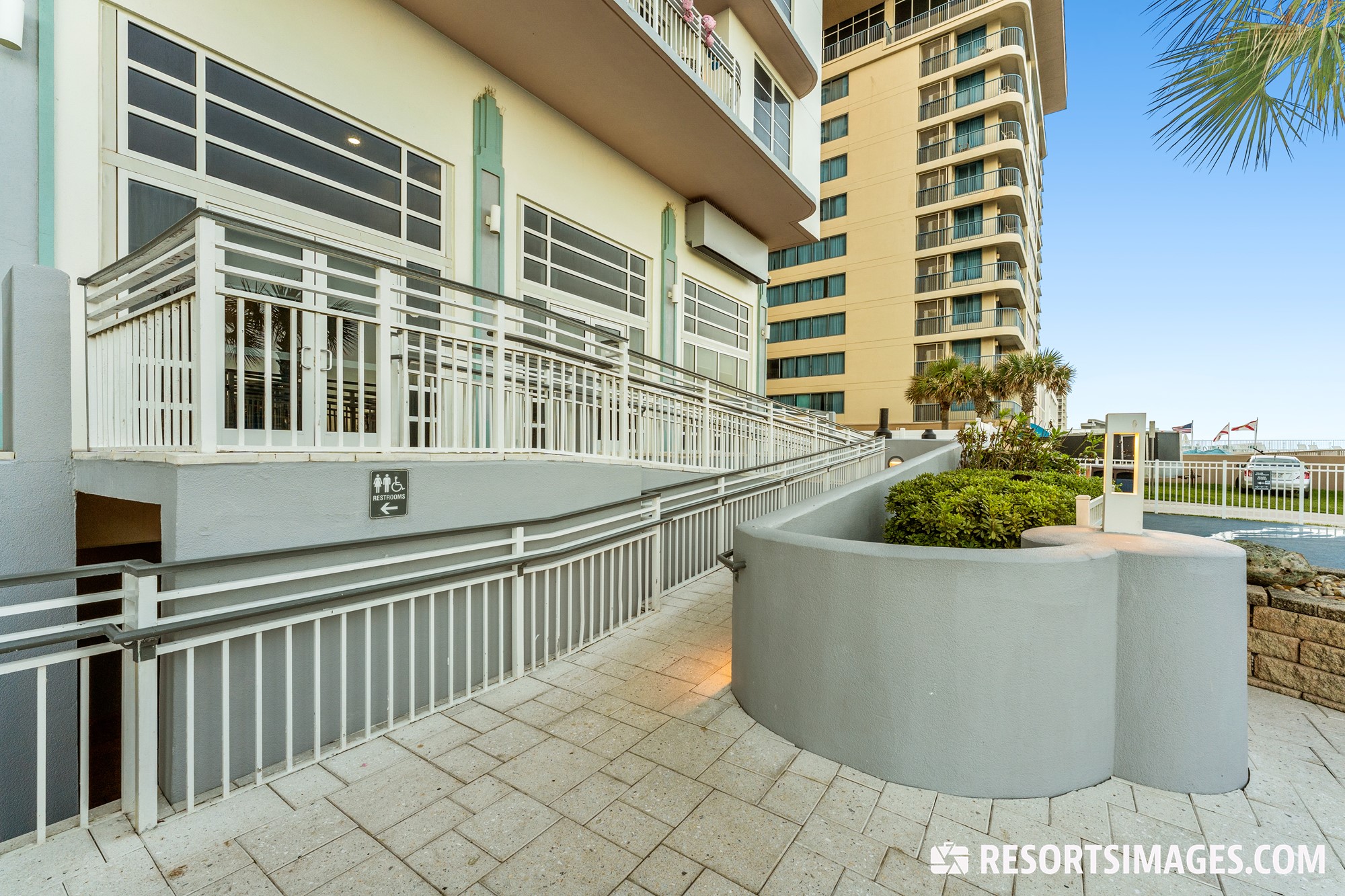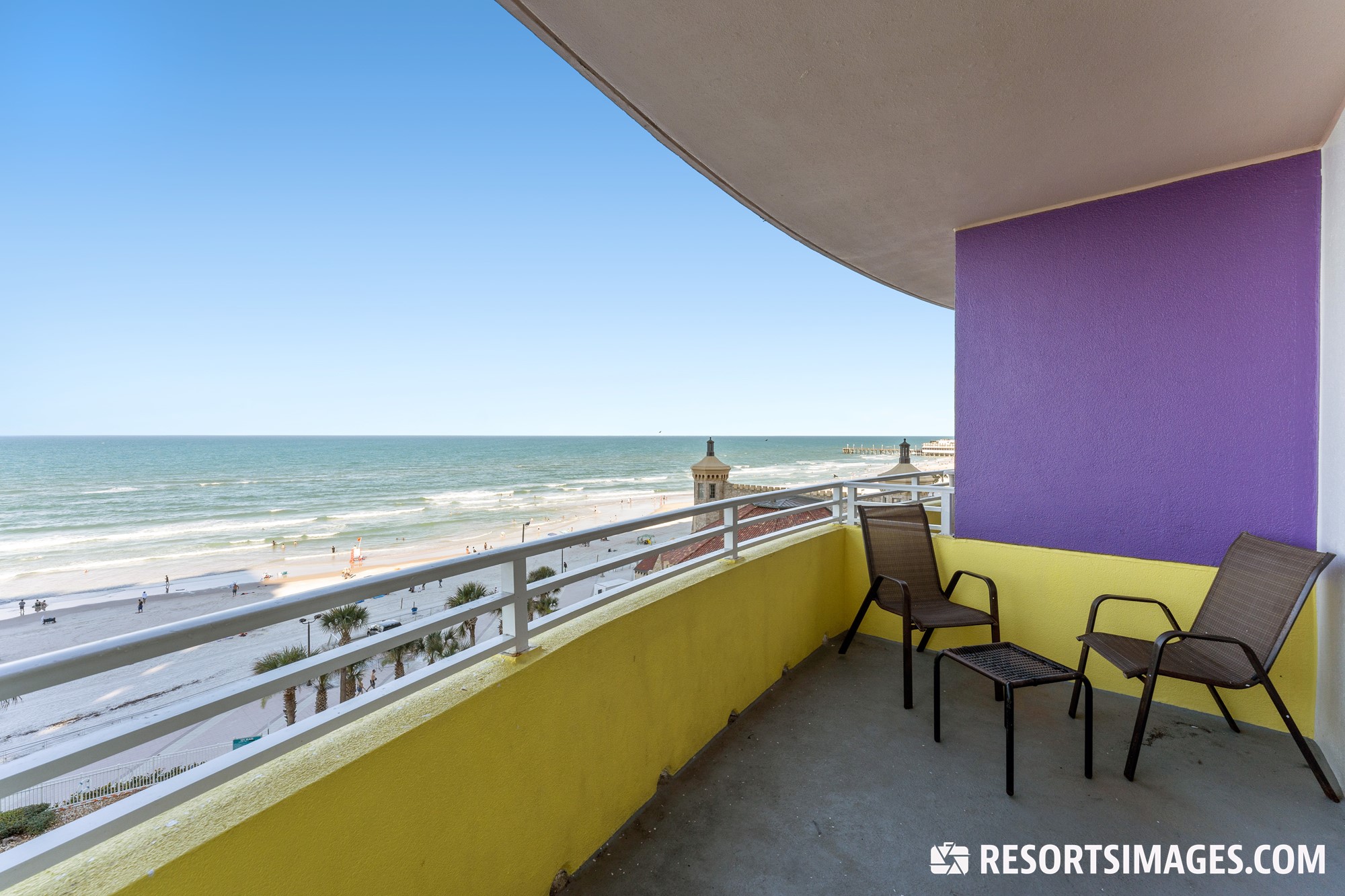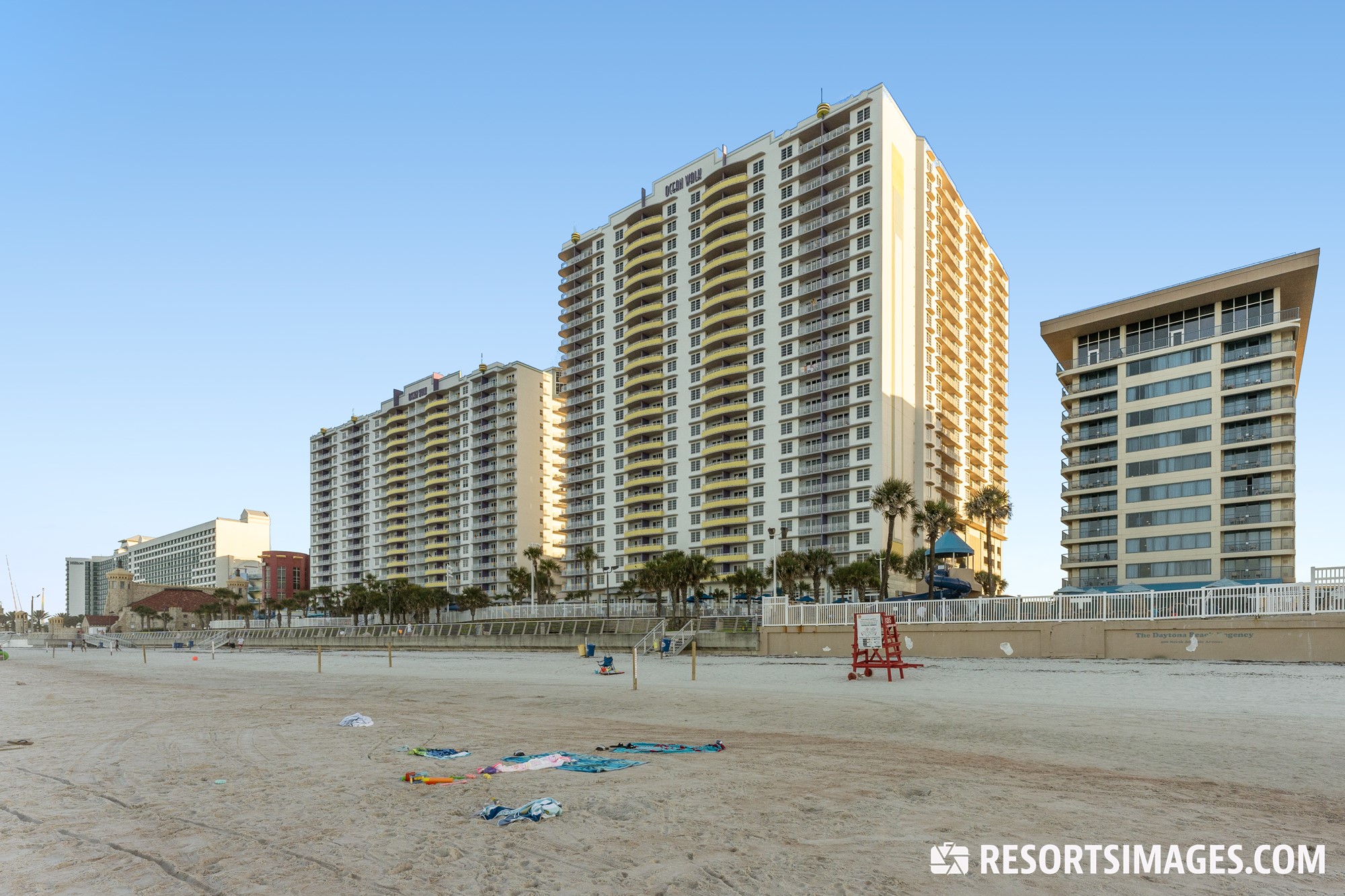 The *Wyndham Ocean Walk* resort is located directly on the beach with a full service food court, lobby bar, exercise room, indoor pool, arcade, gift shop, golf simulator, and activities center. You will also find an outdoor pool, Jacuzzi, lazy river, and water slide. The resort offers a full service banquet facility and in-house chef, and room service. Adjacent to the property is Daytona's newest Ocean Walk Shoppes and Theatres, Bandshell Amphitheater, and Boardwalk.